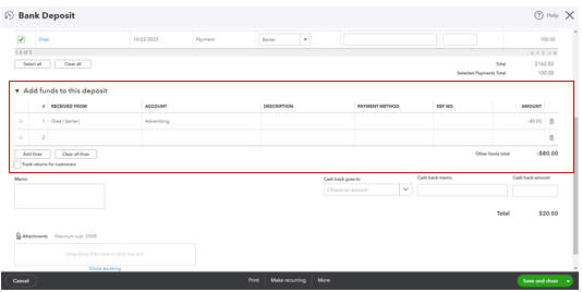 Lastly, generate a bank deposit, and in the section for Add funds to this deposit, input a negative value representing 80% of the amount to be paid to the vendor, while retaining the remaining 20% as income in your account. I've attached screenshots for your visual reference: