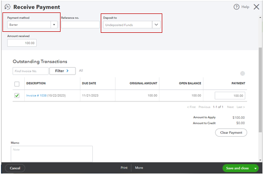 Next, create an invoice and record the payment. Please note that Before recording your barter transaction, ensure that you have added your barter partner as both a vendor (for the bill) and a customer (for the invoice). Since it is not possible to have the same name in both lists, make a slight variation in one of the names.