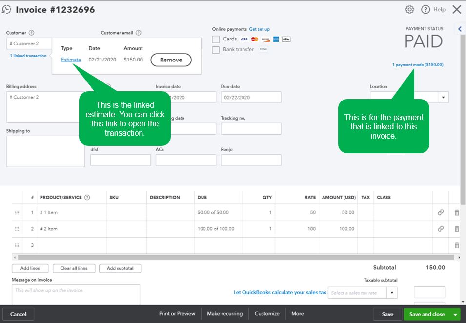 I hope you're having a fantastic week. Estimates can be linked to Invoices if you use the Estimate to create an Invoice. You don't necessarily have to connect them, but it's easier to keep track of a customer paying if you do. The steps below will show you how to link an estimate to an Invoice: