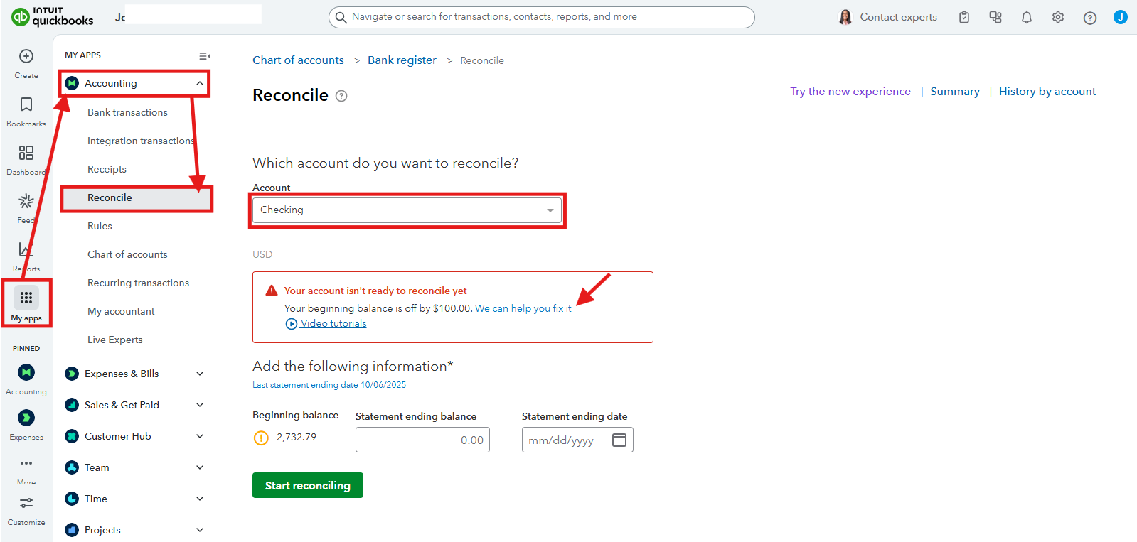 - Your account isn't ready to reconcile yet. Your beginning balance is off by... prompts. From there, click the hyperlink We can help you fix it.