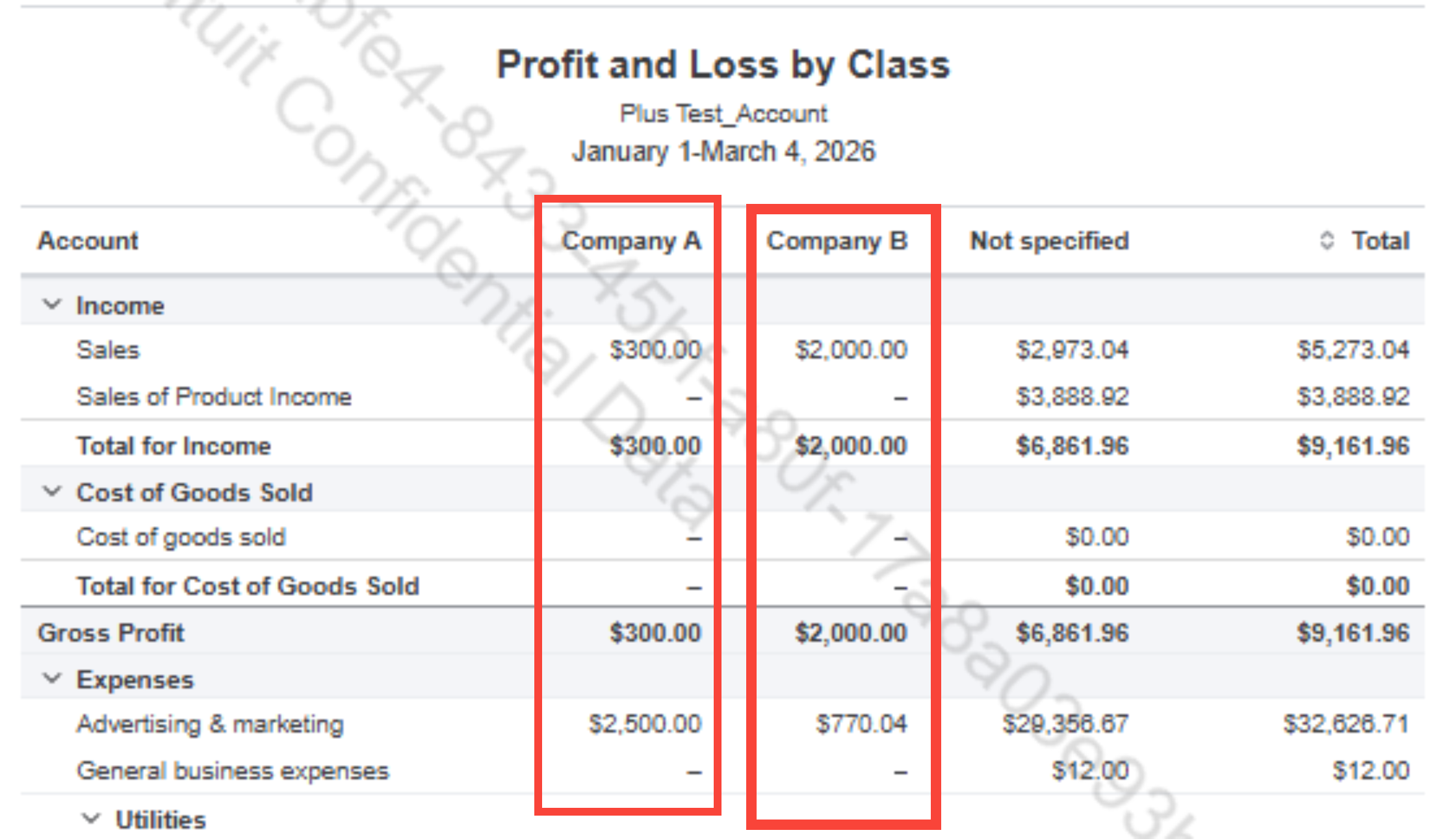 If you have created distinct accounts for each company, you can customize your Profit and Loss report by filtering for the specific Distribution account associated with each business.