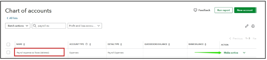 To resolve this issue, we can review your Chart of Accounts to see if the account was mistakenly deleted. If so, we can restore it by following the steps below: