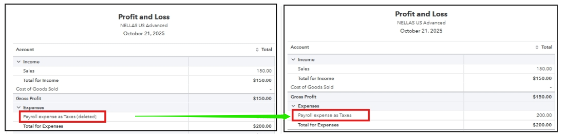Once you’ve restored the deleted account, the "Taxes (deleted)" label should disappear from your Profit and Loss report, and your payroll expense reporting will reflect correctly. Please see the image below for your reference.