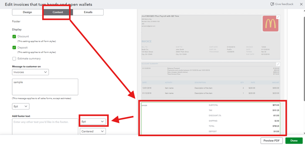 - You can also change the Font size of the Footer to the lowest font by going to Content.