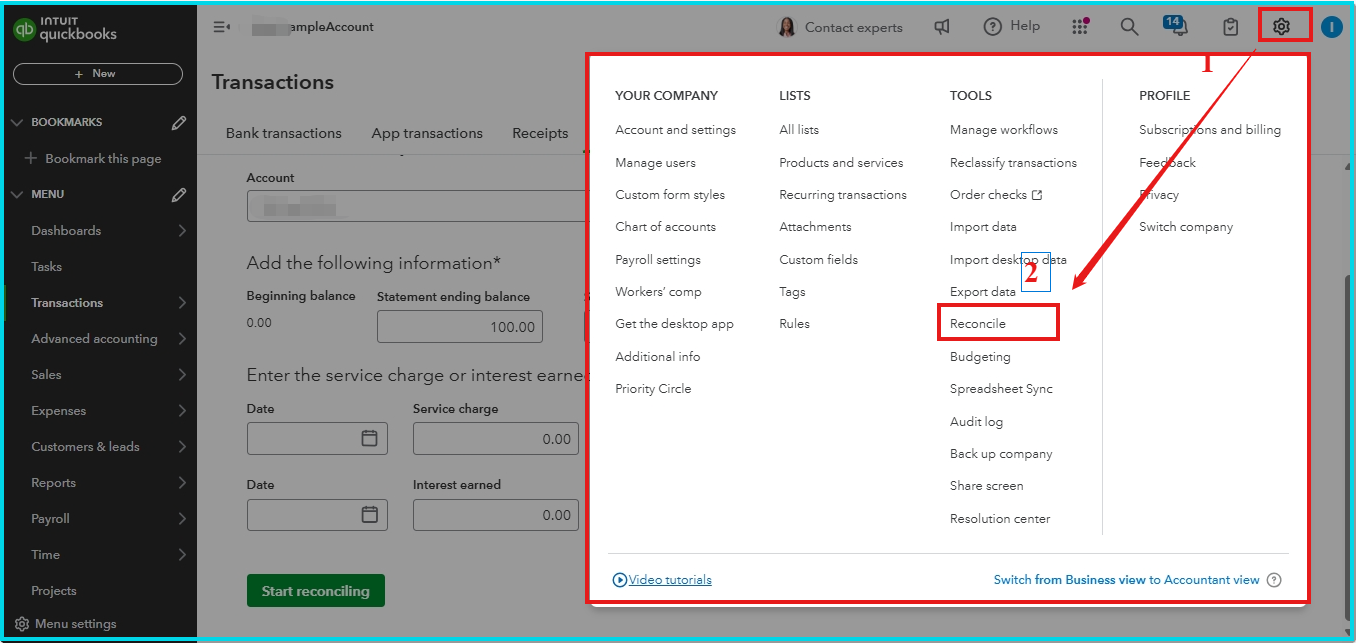 - Click the drop-down list for Account, then select the account you want to reconcile. Make sure it's the same one on your statement.