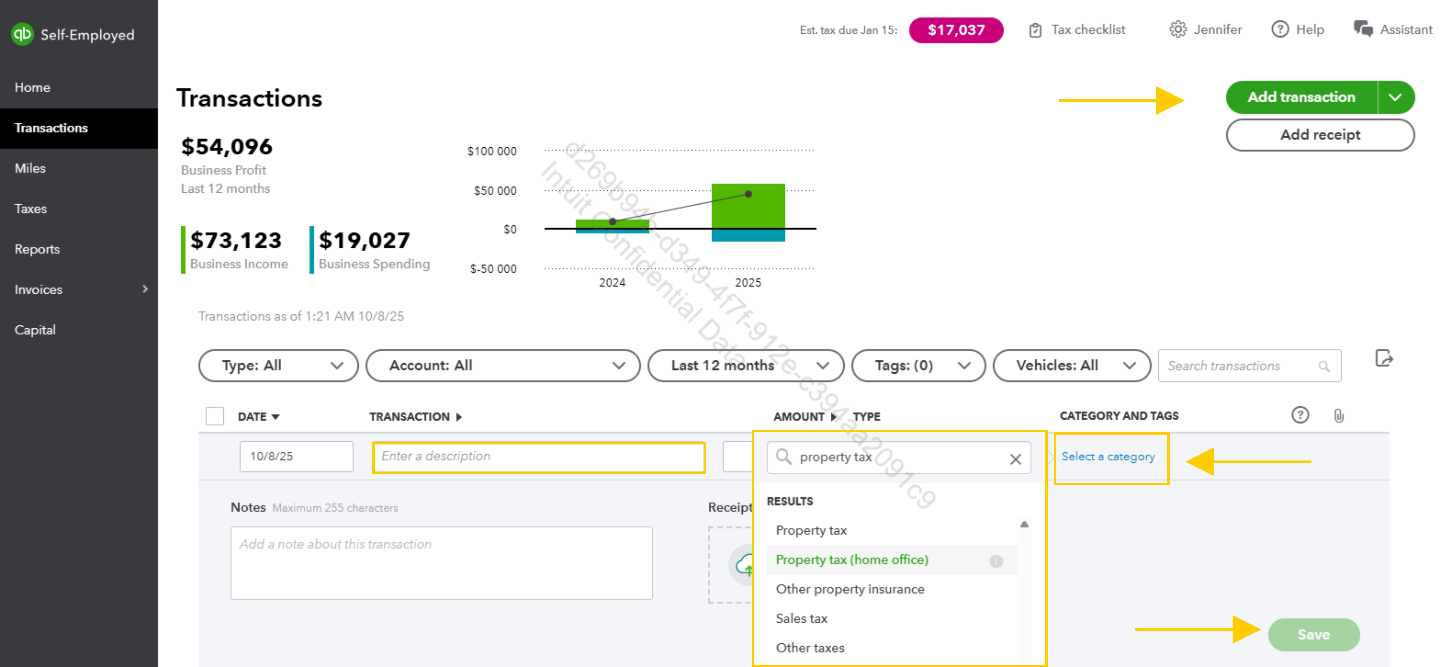For any cash payment, like your property taxes or vehicle costs, you'll need to manually enter the transaction since it didn't come through a connected bank account.