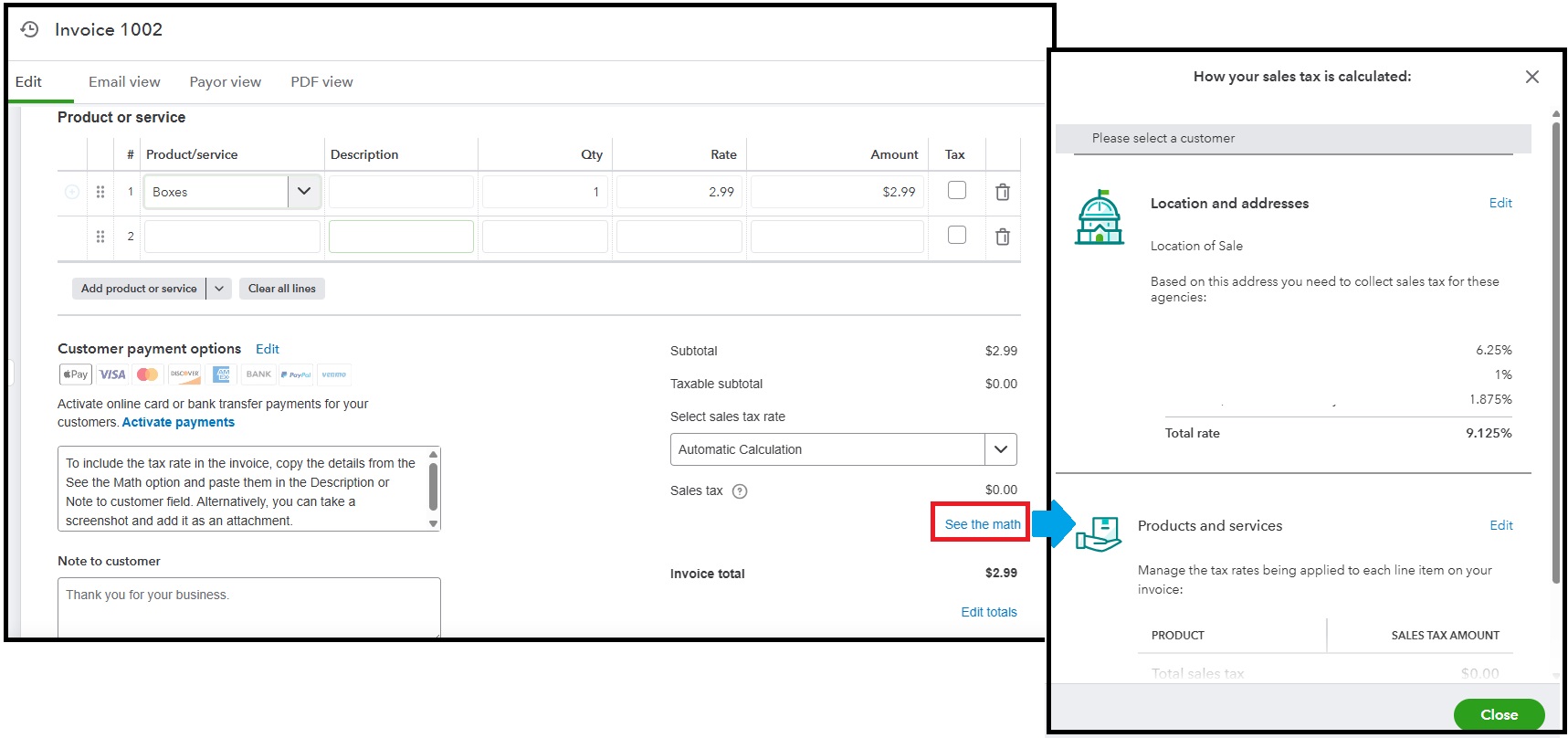 To include the tax rate directly in the invoice's content, copy the details from the See the Math option. You can then paste them in the Description or Note to customer field. Alternatively, you can take a screenshot and attach it to the transaction.