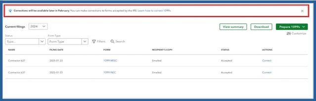 1099 Corrections are already available as of February 19, 2025. However, there's a temporary limitation about updating the contractor/vendor's name and TIN. Our engineers are already aware of this and are working to enable this feature as soon as possible.