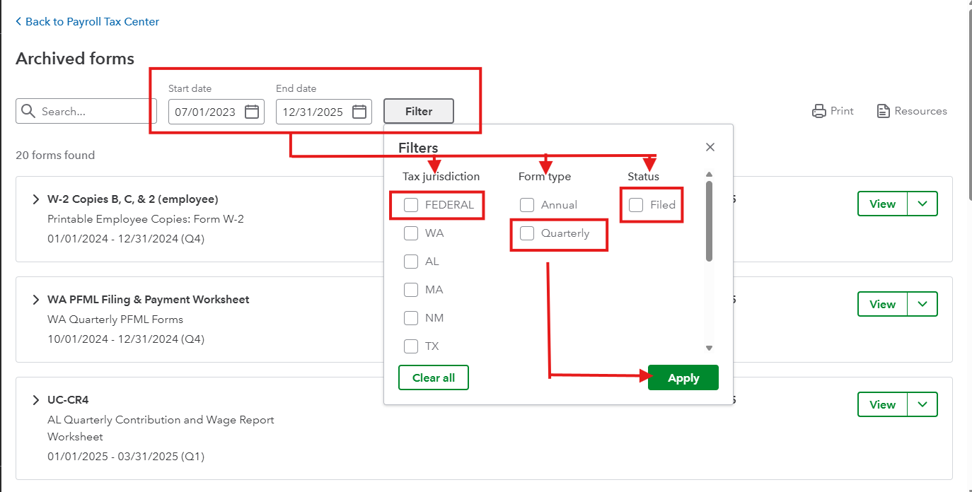 - Check the boxes for Federal, Filed, or Quarterly, and then click Apply.