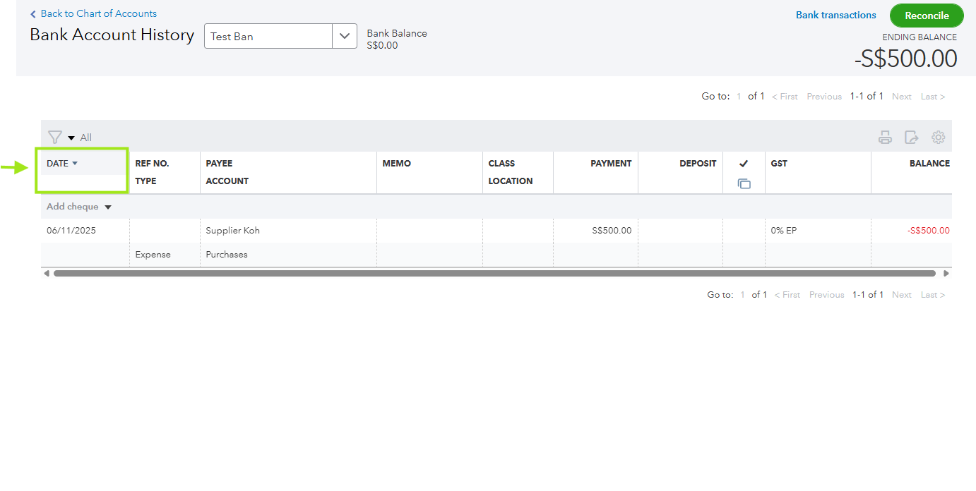 - Find the Date column header at the top of the register window.