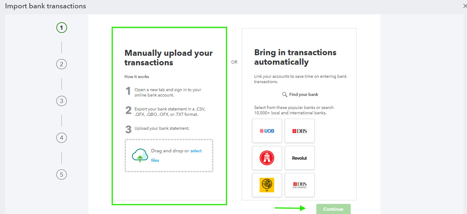 4. Then, click Drag and drop or select files to choose your bank file and select Continue.