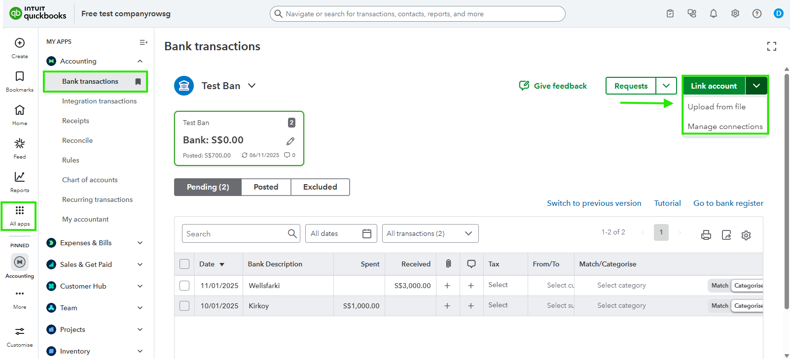 2. Next, in QuickBooks Online, go to All apps then in the Accounting section choose Bank transactions.
