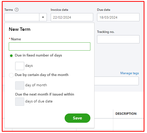 - Enter a name for the term, then set the number of days on the Due in fixed number of days.