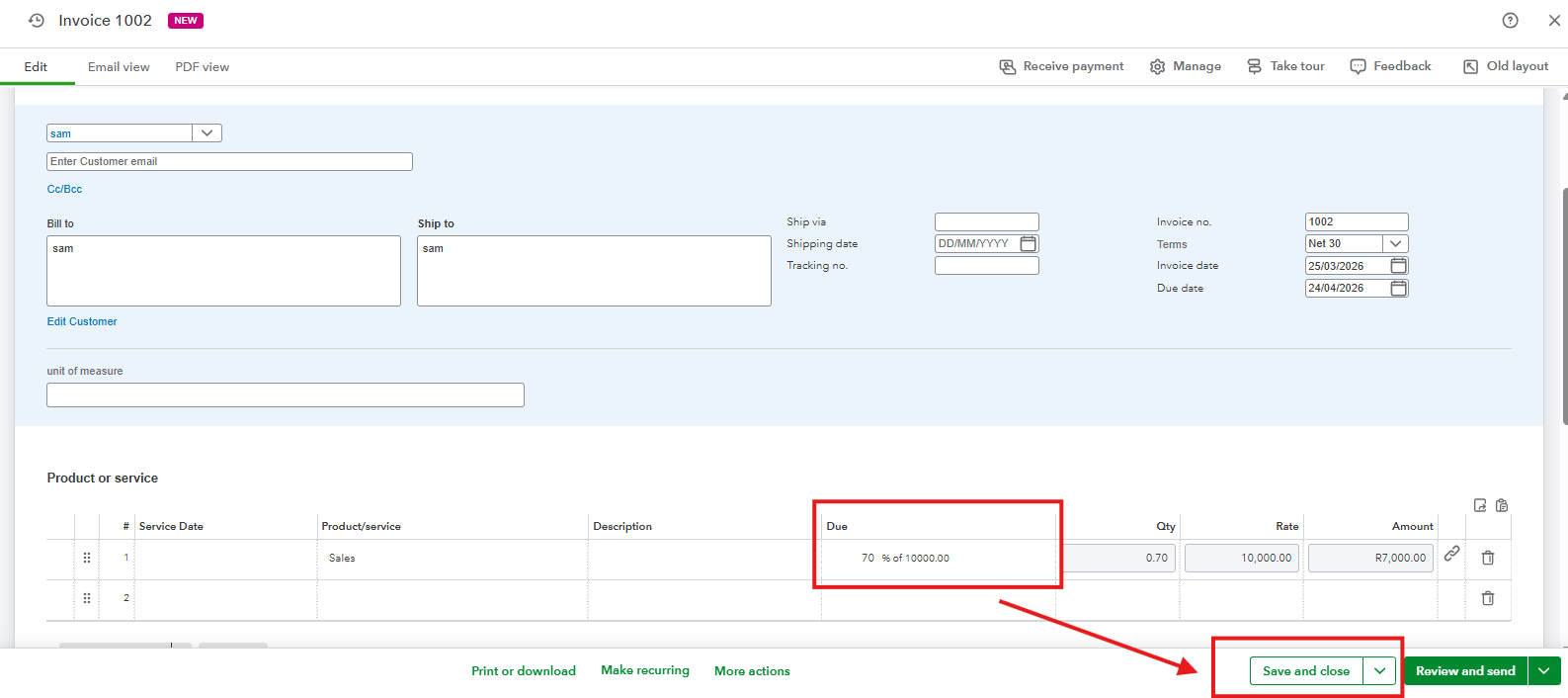 To update your progress invoice, find the specific invoice under Customers in the Customer Hub and select View/Edit. Simply enter the new percentage in the Due column to refresh the total, then click Save or Save and close to apply the changes.
