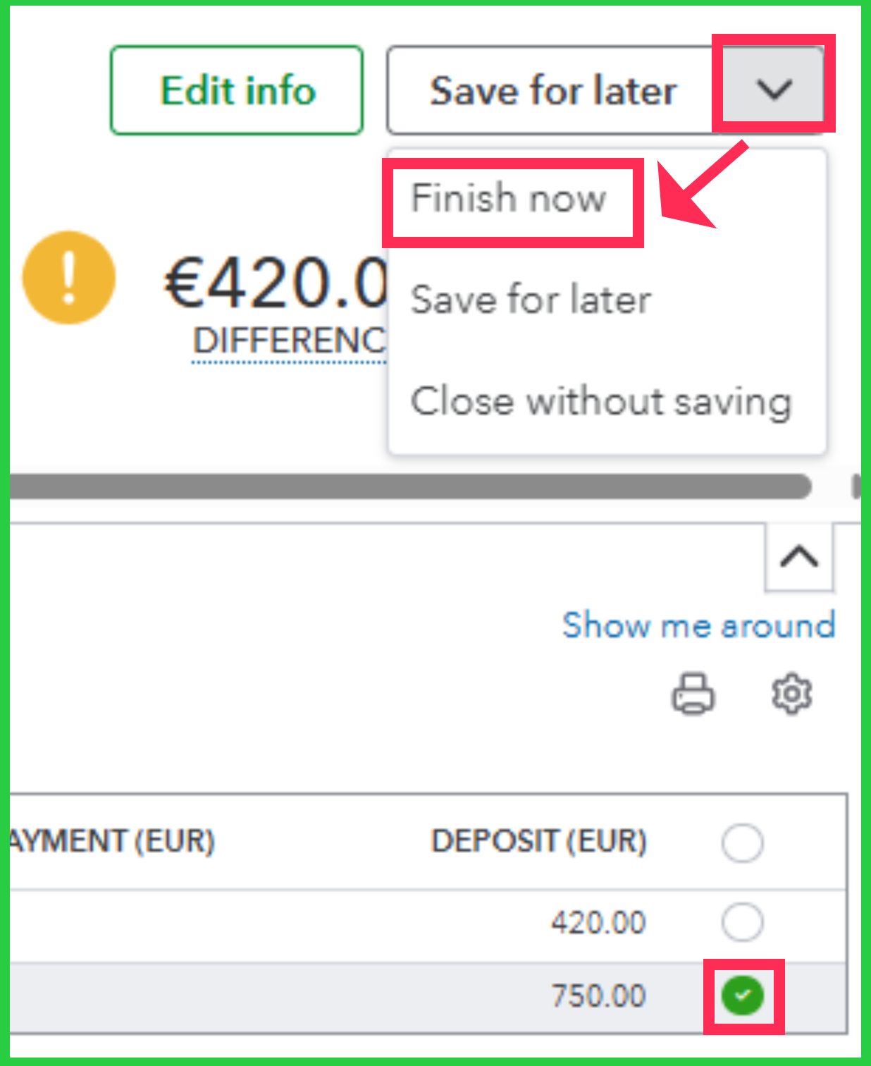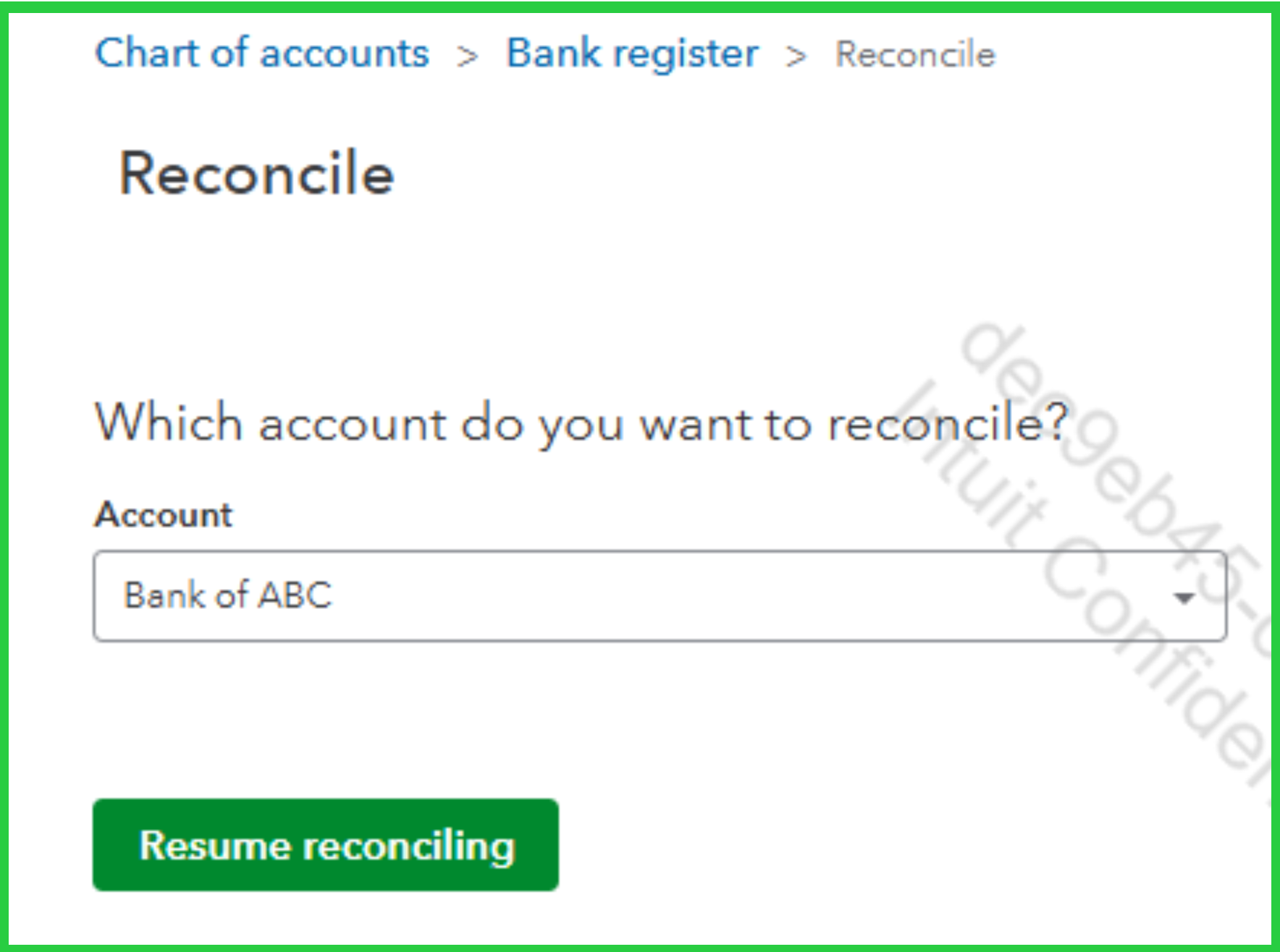 If you chose Save for later after unchecking the topmost tick box on the reconciliation screen, all transactions will be left uncleared. However, you can return to where you left off by selecting the Resume reconciling option for that account. Then get your bank or credit card statement and clear the transactions by checking their corresponding matches in the reconciliation screen. Afterwards, click the Finish now option to complete the reconciliation for the account.