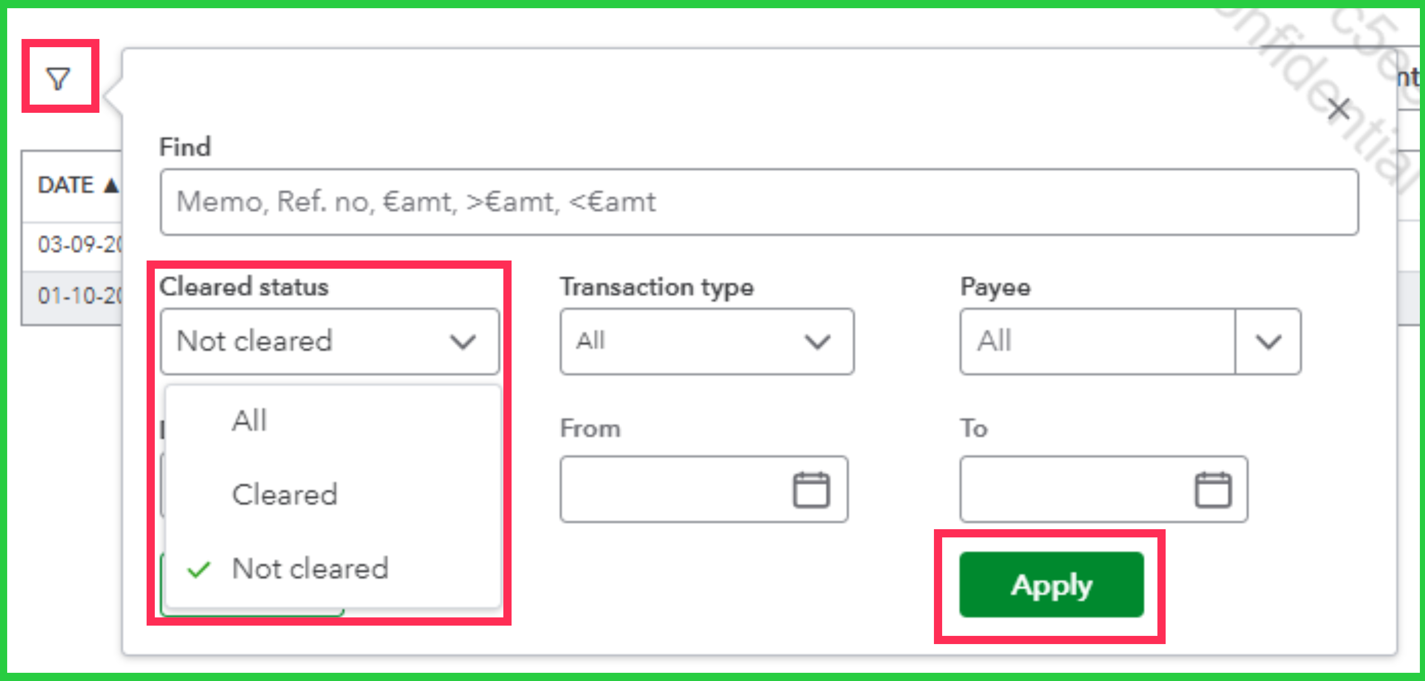 To help with reconciliation, you can use the Filter (funnel icon) and choose either Cleared or Not cleared from the Cleared status dropdown to sort transactions.