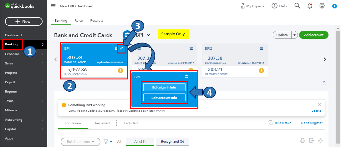 Then, you'll have to sign in to your bank's website. This is to check your account page for messages or alerts that need your attention.  Once you make changes on the website (i.e. login credentials and account info), you'll have to update QuickBooks as well. Here's how: