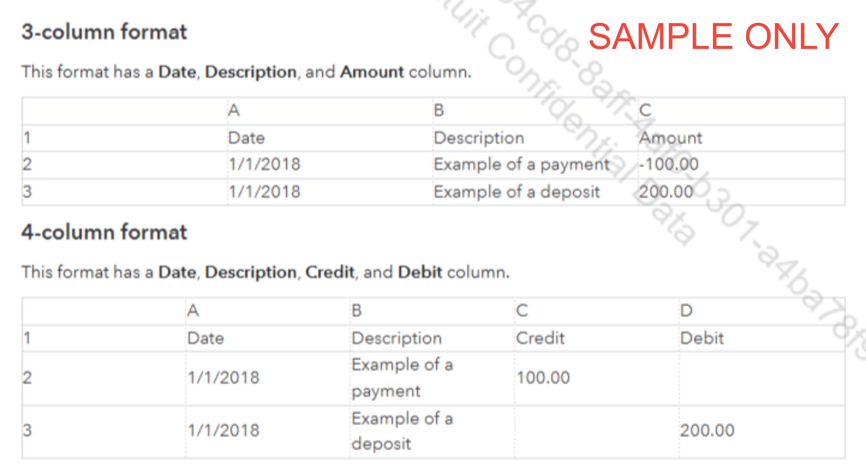 To ensure a smooth upload, please make sure the file size is smaller than 350 KB and that it includes the appropriate data structure, either 3 columns (Date, Description, Amount) or 4 columns (Date, Description, Credit, Debit). Please check the image below.