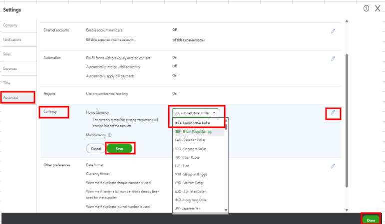 To begin, please note that your home currency in QuickBooks is based on the location of your business which can be changed directly in your Accounts and Settings. However, once you've turned on the Multicurrency feature, the option to change it is unavailable.