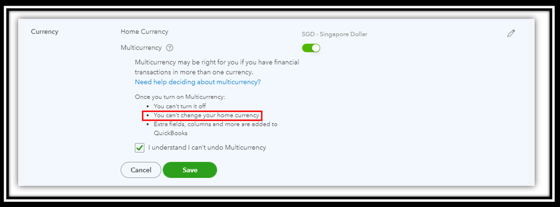 Part of the agreement before turning on the Multicurrency feature in QuickBooks is it fixed the home currency. For visual reference, refer to the screenshot that I've attached below.