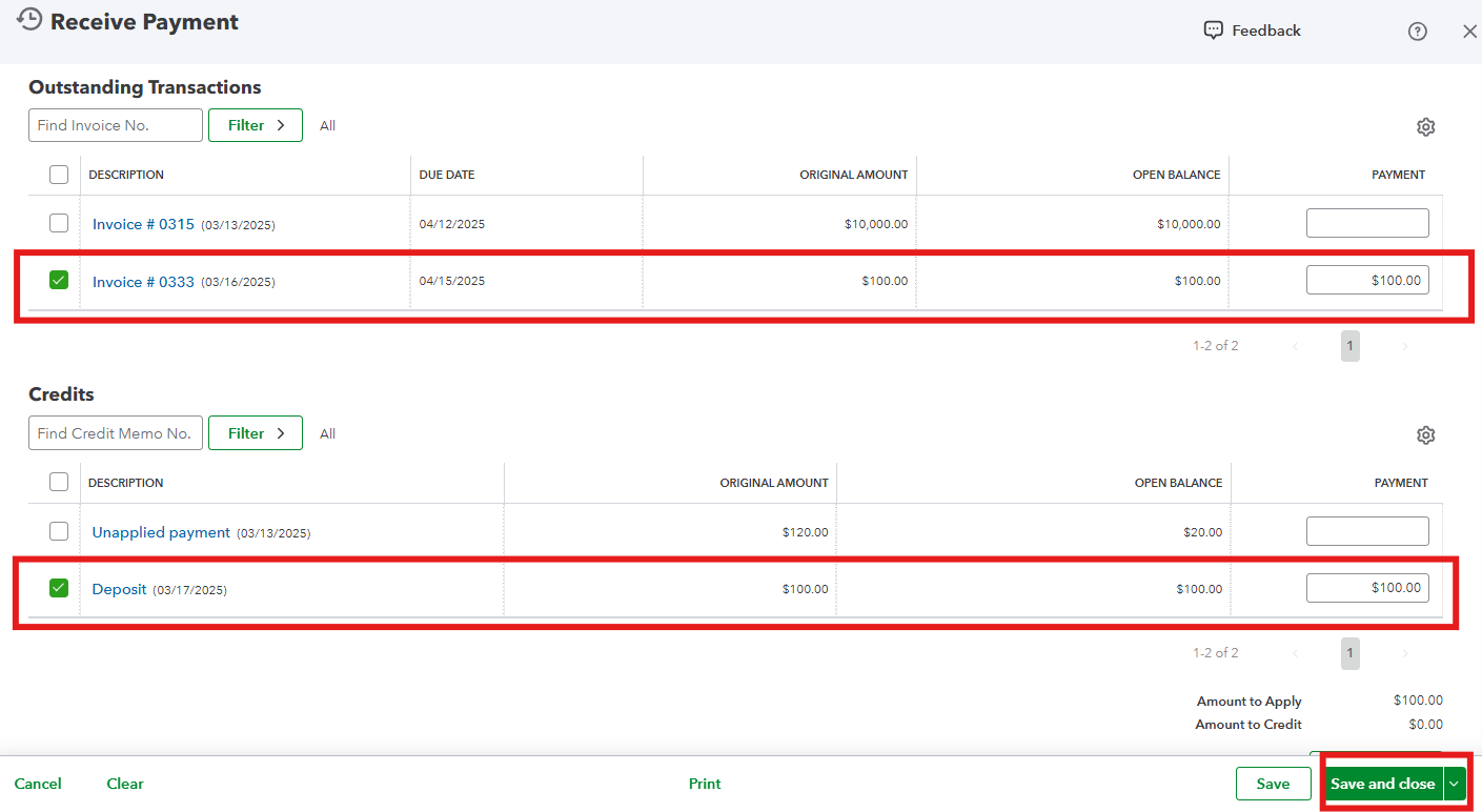 After that, to mark the invoice as paid using the deposit, here's what to do: