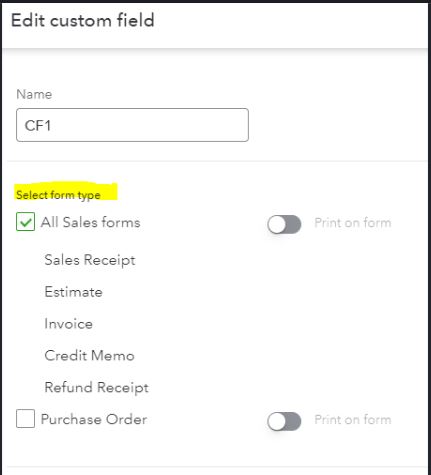 In QuickBooks Online Plus and Essential, you can create a custom fields on your sales forms. However, if you are using this versions of QBO, then selecting the type of data is unavailable. This is the reason why you can't see the option in the page.