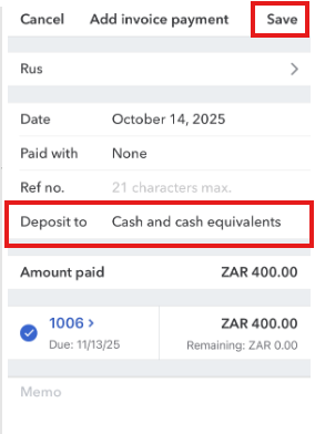 If you are using iOS, you can process a payment for the invoice and directly assign a bank or account. After opening the paid invoice, it will display as Deposited.
