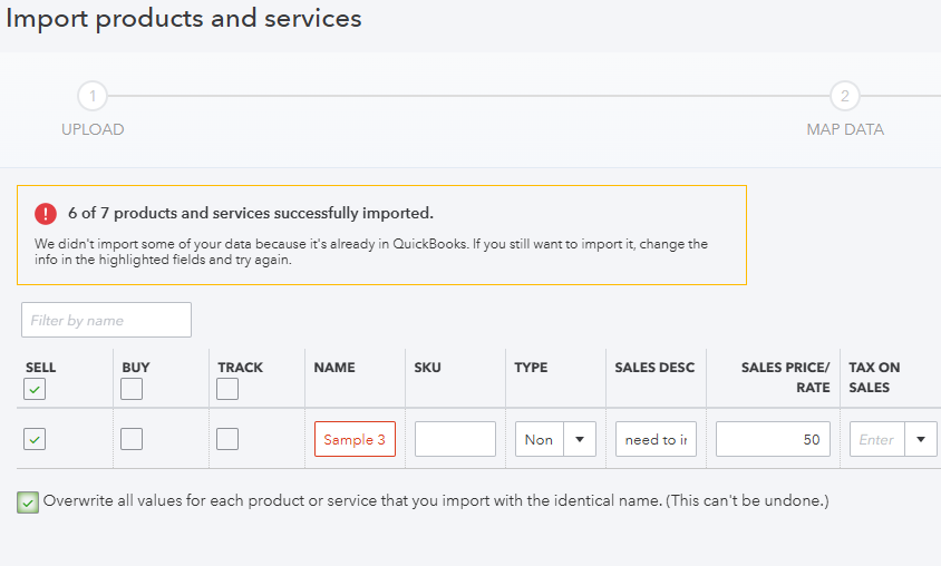 I am trying to import an Excel file to update the product and services list. Specifically, I am attempting to change the sale price and cost of goods for existing items. However, the system is denying the import, stating that the product names are the same. Even after attempting to import without changing the product names, the import is still denied with a message to "change the info in the highlighted fields and try again". Could you please provide some guidance on how to resolve this issue?.