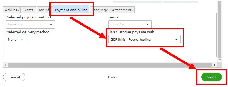 If you'd like to create an invoice using a foreign currency, create a customer's profile first. Then, set the currency under This customer pays me with box under the Payment and billing section. Please take note that the feature to set 2 currencies in an invoice is currently unavailable. The invoice will base the currency from the customer's profile that you set.