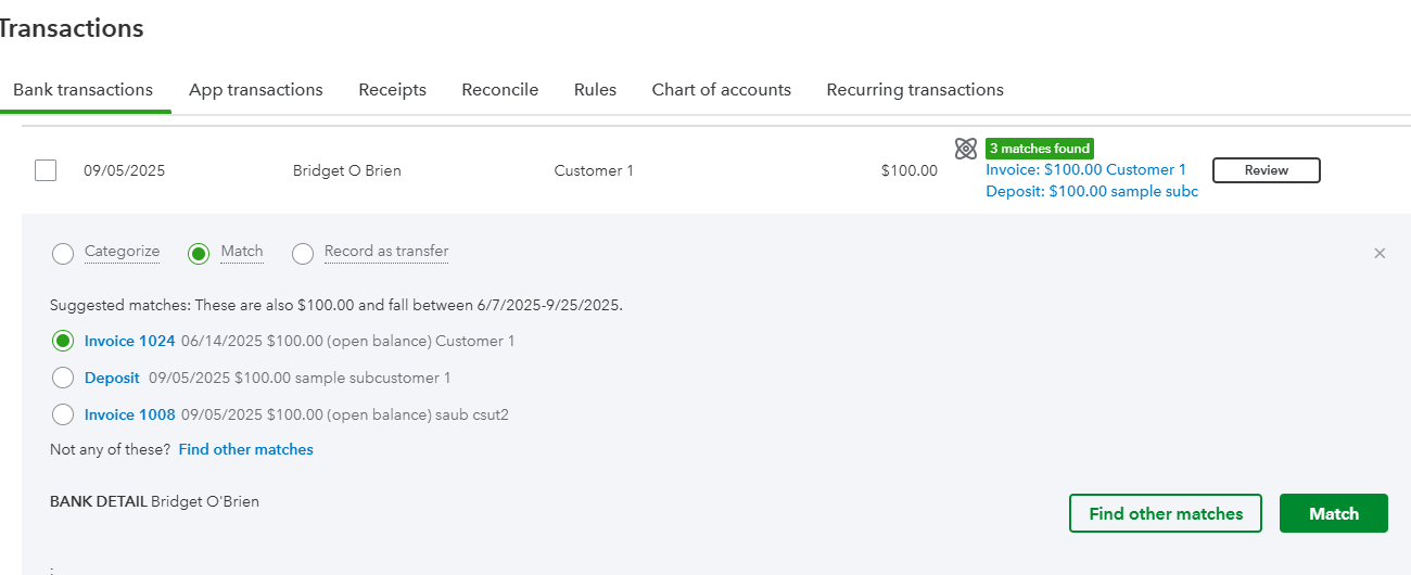 Here's also an article that will serve as guide when matching bank transactions: Match online bank transactions in QuickBooks Online.