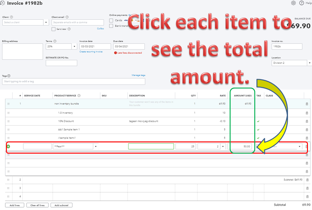 I have some information about the total of the line item in the bundle. When you enter a bundle in the invoice, you'll only see the total amount of it. However, if you want to view each line item's total amount, you'll need to click the item to see it. It is posted in the Amount column.