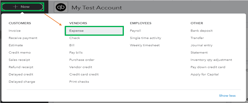 1. In QBO, go to the + New option at the top left to get to the Expense