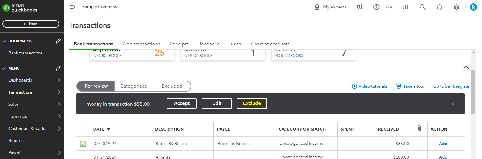 If the bank transactions are still on your Banking page, we can remove them by clicking the Exclude button. Here's how: