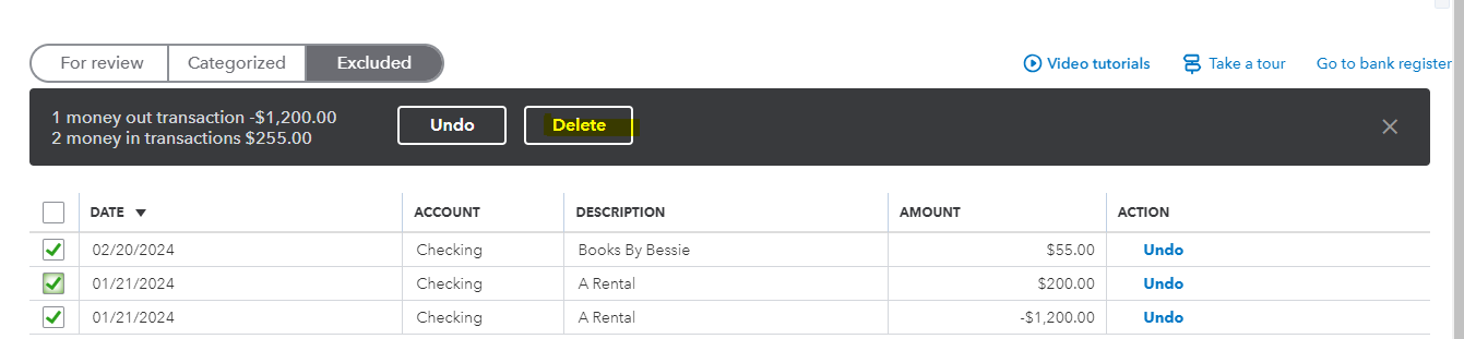 The transaction moves to the Excluded tab of the Banking page. You can delete the transactions from there.