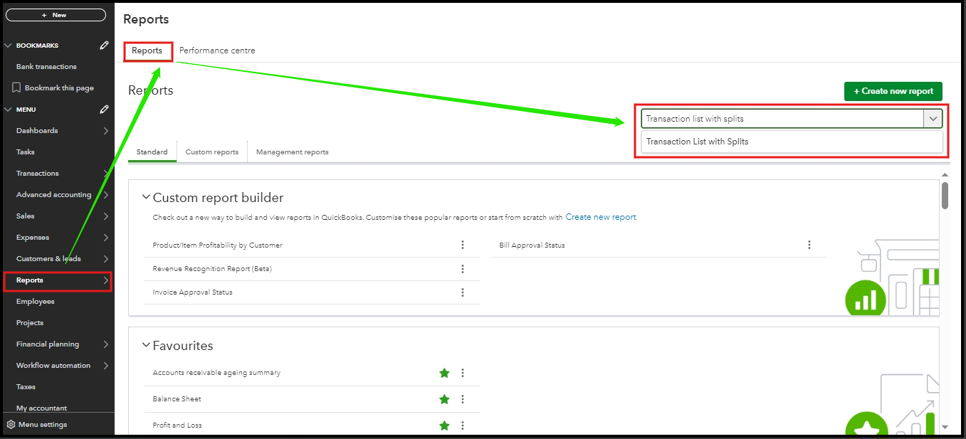 2. In the Reports page search field, type Transaction List with Splits and open it from the dropdown list.