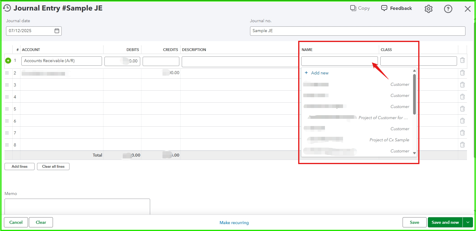 When recording Accounts Receivable (A/R) in a JE, you have to connect it to a customer, as this represents money owed to your business by that specific customer. Linking the Name ensures accurate record-keeping, keeps customer balances organized, and simplifies the process of tracking transactions and outstanding amounts.