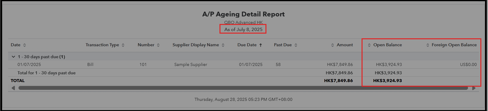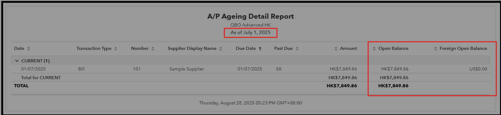 The difference arises from the cutoff date you selected for the report. If payments were applied to a bill after this cutoff date, the Open Balance will show the updated payment status. However, the Foreign Open Balance may not match, as it reflects amounts based on conditions that existed before the cutoff date.