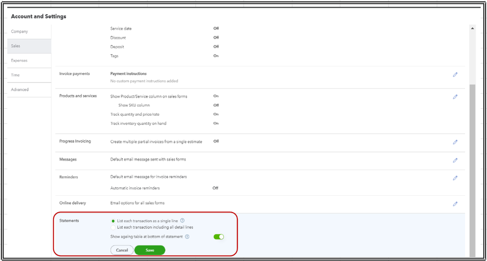Currently, statements in QBO don't offer the same level of customization as invoices. However, you can display each transaction on a separate line and include an aging table at the bottom. Here's how you can do it: