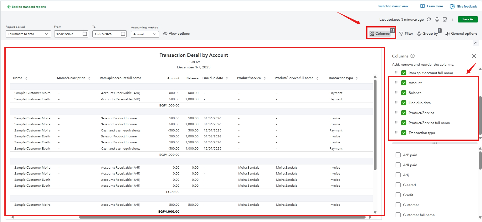 You can create a customized view using the Transaction Detail by Account report to add those details.