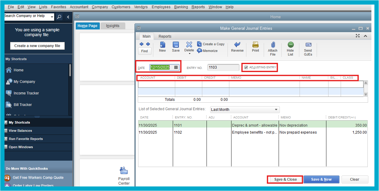 - Before saving, check the Adjusting Entry box to mark it as an adjusting journal entry.