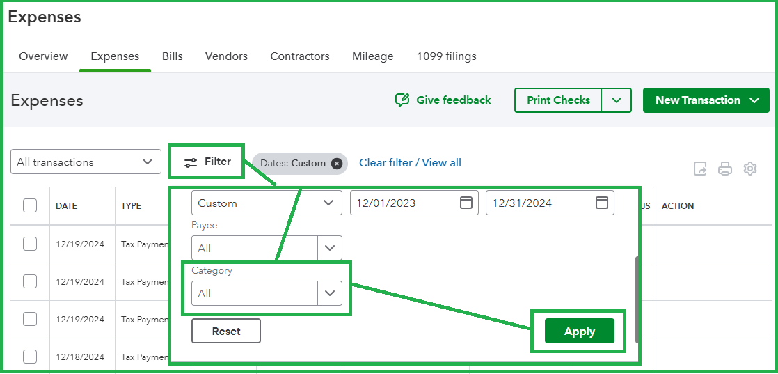Currently, QuickBooks doesn't have a direct report where you can specifically filter a category. With that in mind, we can navigate to the Expense page and filter it. To do so, here's how: