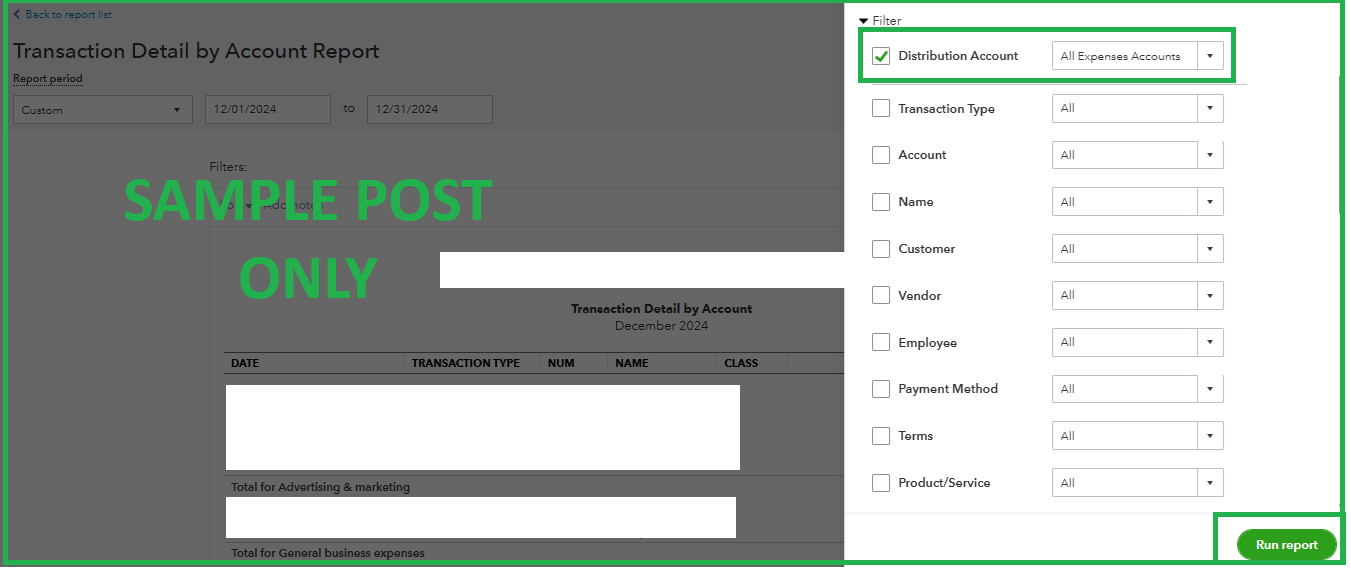 Alternatively, you can also pull up the Transaction Detail by Account report as this provides a detailed insight into viewing your expenses by account. To do so, here's how: