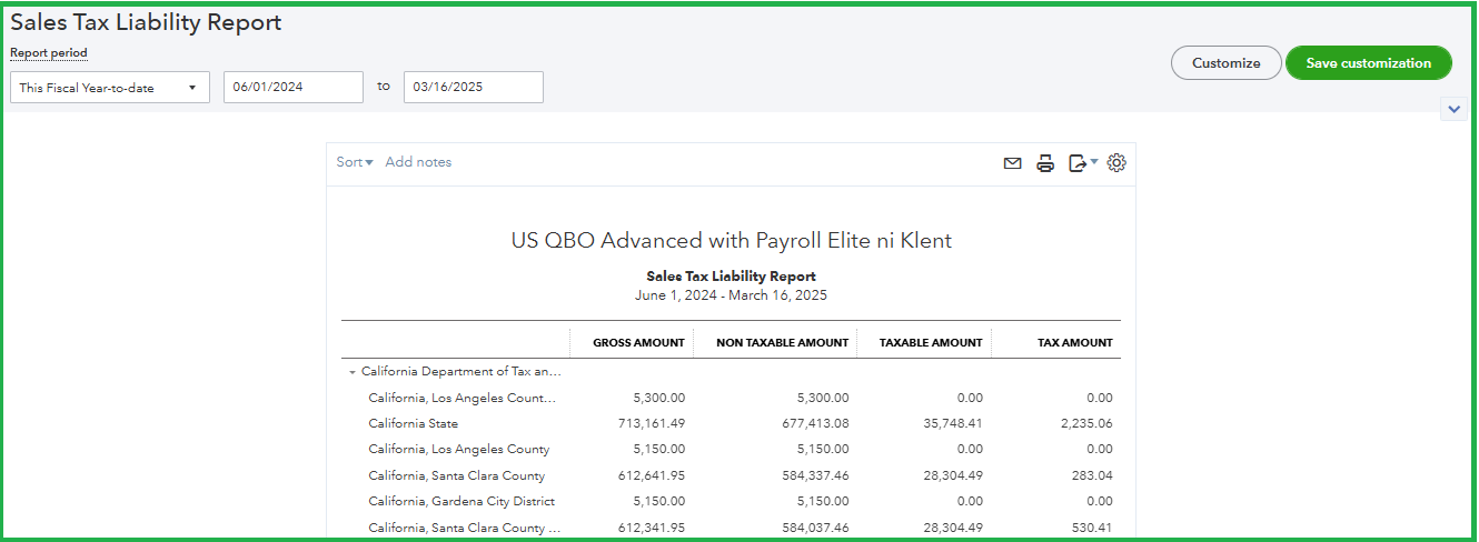 Moreover, to view your sales tax transactions, you can generate the Sales Tax Liability report. It shows the detailed sales tax amount collected and owed to various tax authorities for a specific period. To run this report, please follow the steps below:
