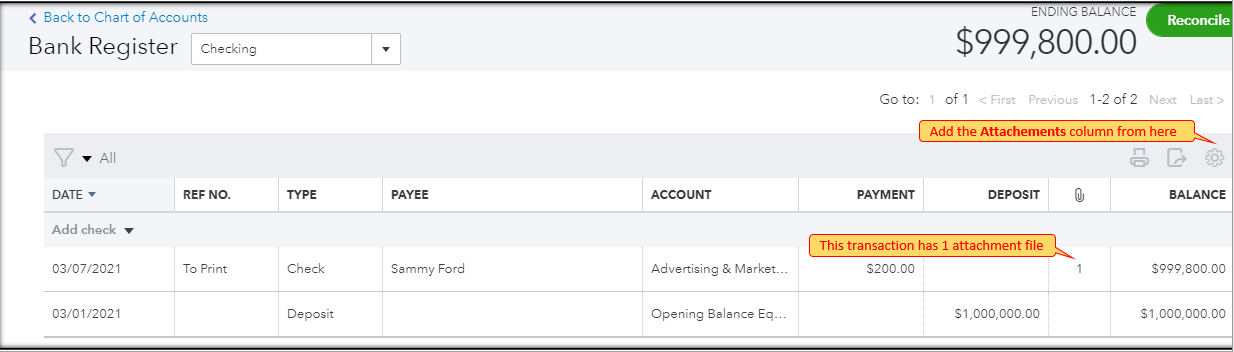 On the other hand, when you open an account register and add the Attachments column, you will see how many files are attached to your transactions.